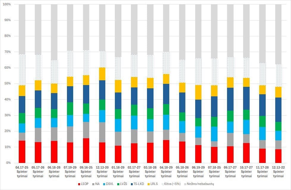 Gruodžio 13-22 dienomis visuomenės nuomonių tyrimų bendrovė „Spinter tyrimai“ vykdyta apklausa rodo iš esmės stabilią situaciją, visų partijų pokyčiai paklaidos ribose, didesnis tik DSVL kritimas -2,3pp, kas vis tiek dar patenka į paklaidos ribas / nuoroda